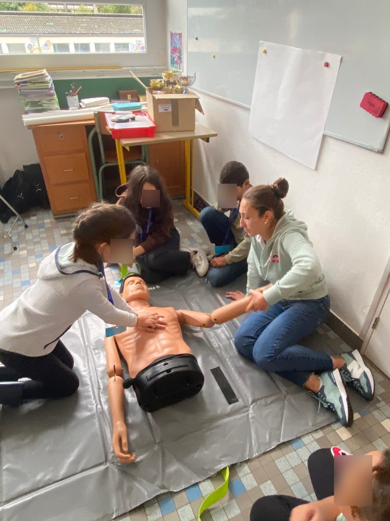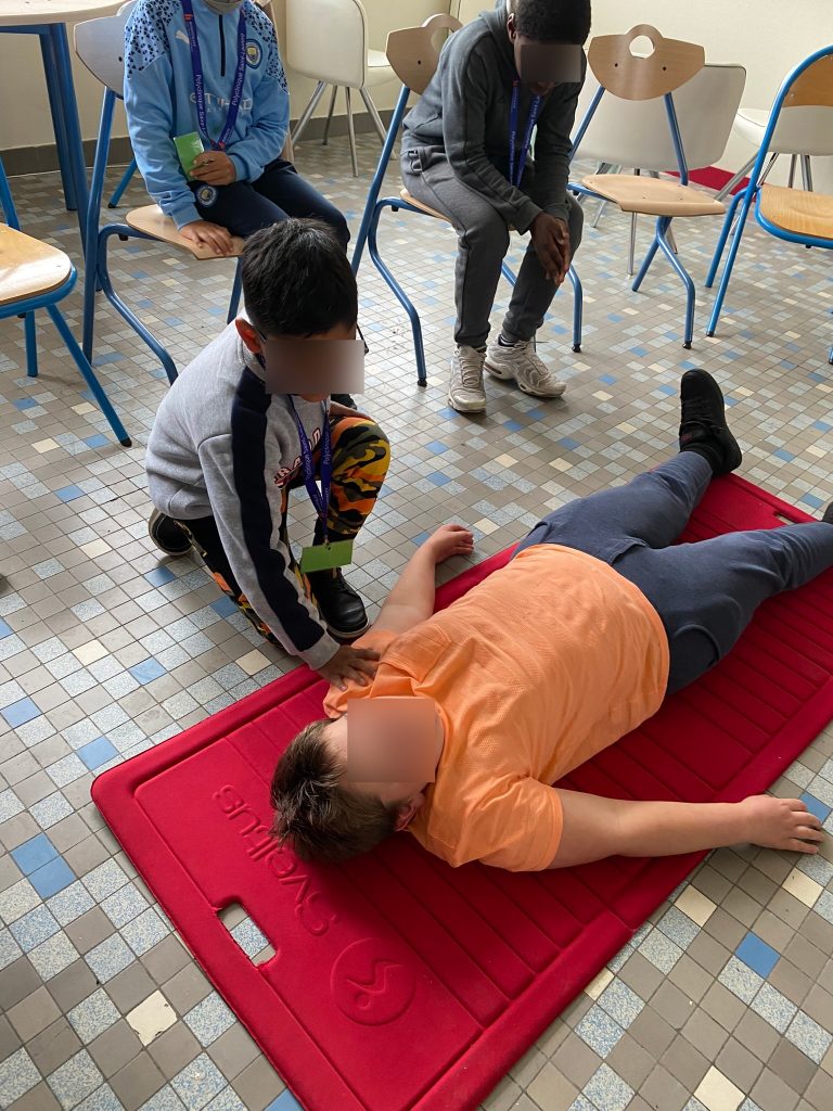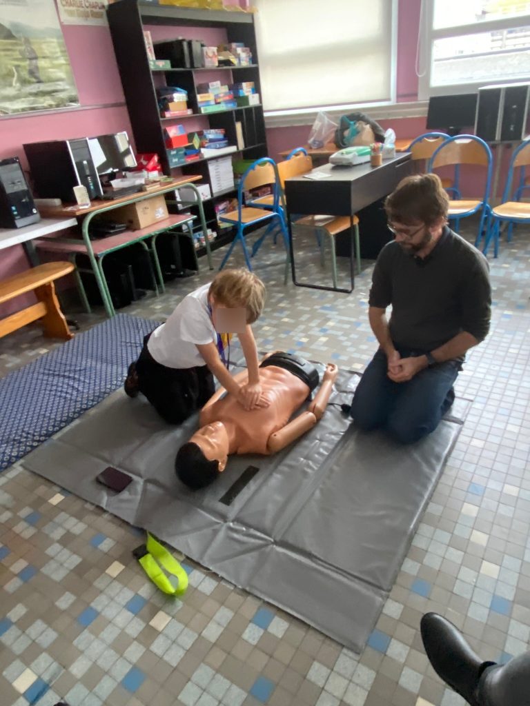 Jeudi 19 octobre, l’association Les Sauv’Coeurs est intervenue dans la classe de CM pour initier les élèves aux 1er secours. Trois ateliers tournants ont été proposés :