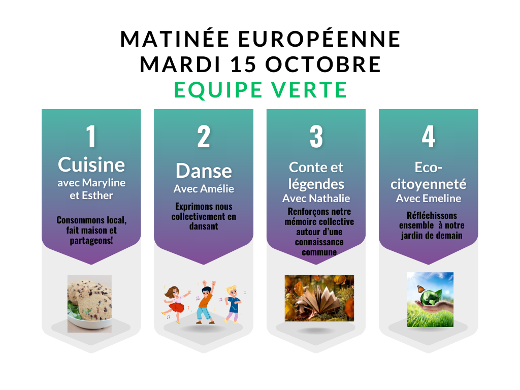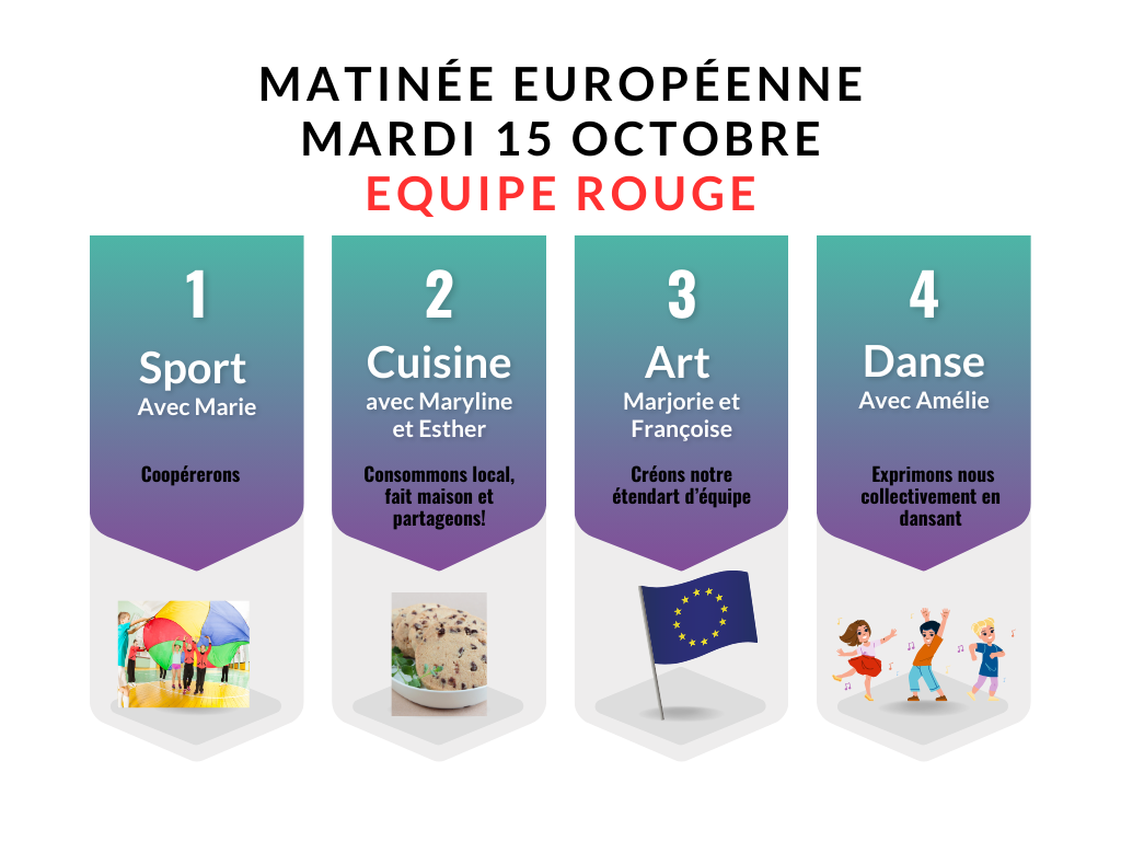 Première matinée européenne pour nos élèves ce mardi 15 octobre 2024. Répartis en 12 casas mélangeant les élèves de PS au CM2, ils se sont déplacés de manière autonome en suivant leur feuille de route dans les différents ateliers proposés par les enseignants. Une façon de responsabiliser les élèves et de favoriser la collaboration des grands avec les petits.