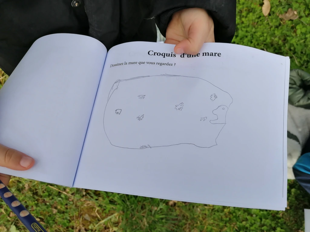 Avant de commencer à créer, les élèves se sont imprégnés de l’environnement de la mare à l’occasion d’une promenade à la coulée verte. Munis de leur carnet d’explorateur, les élèves ont découvert le milieu de la mare, ses habitants, ses couleurs, ses odeurs…ils ont pu réaliser des croquis et ramasser des « trésors » de la mare.