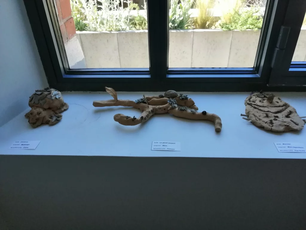 Puis, le travail de création a commencé…modeler l’argile, imaginer sa propre petite bête de la mare, trouver un nom original à son oeuvre, travailler sur des productions collectives…les élèves ont mis leurs compétences en oeuvre pour réaliser à la fois un projet individuel et collectif.